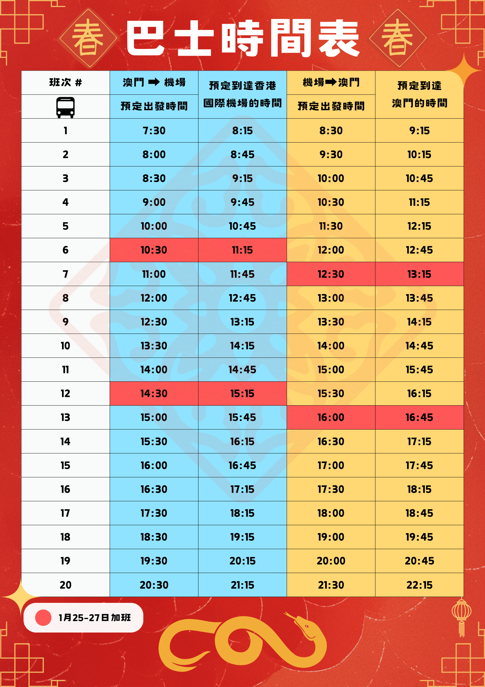 1月25日至27日期間,本公司特設農曆新年班次,讓您出遊更便利!