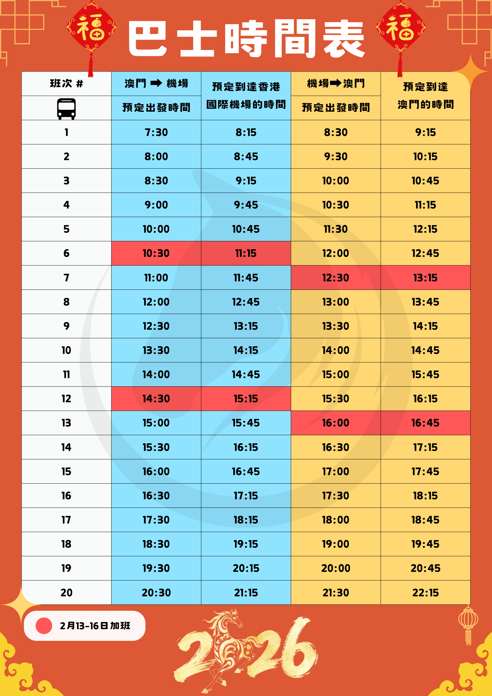 马年开跑,福气满满!我们香港机场直达新年加班表出炉啦‼新增多个班次,保证令您轻松到达目的地。不论是放松休息或是享受购物美食,我们都已为您周到考虑!想去澳门感受年宵和游览经典景点,或前往香港机场出发到世界各地,我们都能让您全情投入新春的快乐!温馨提示:请提早计划您的行程,避免高峰期出行。持续关注官方讯息,获得班次更新。愿您马年运势通达,一切顺心!